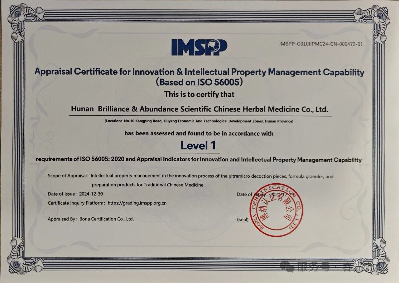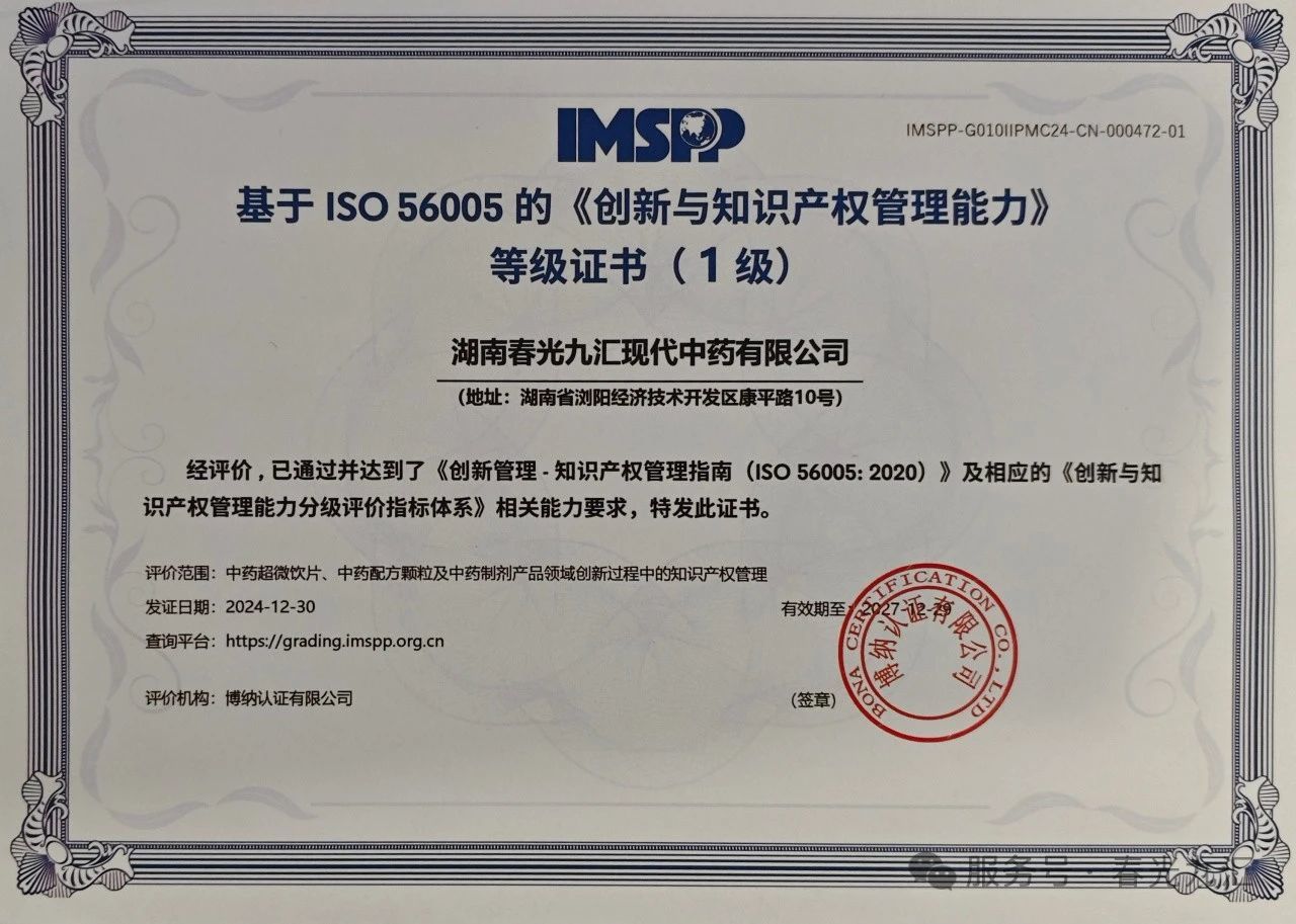 Recently, the company has successfully passed the comprehensive audit and high-standard evaluation by Bona Certification Co., Ltd., earning the "Level 1 Certificate for Innovation and Intellectual Property Management Capability under ISO 56005." This achievement positions it among the first pharmaceutical enterprises in Hunan Province to obtain this tiered certification, marking a significant leap forward in the company's innovation and intellectual property management capabilities.